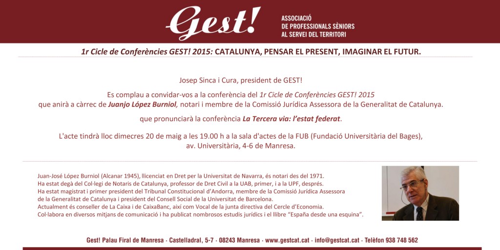 El notari i membre de la Comissió Jurídica Assessora de la Generalitat de Catalunya, Juanjo López-Burniol, serà el dia 20 de maig a UManresa-FUB per participar en el cicle de conferències ‘Catalunya, pensar el present, imaginar el futur’, que organitza Gest! Associació de Professionals Sèniors al Servei del Territori. La conferència s’emmarca també en el cicle Fem Empresa, que organitzen els estudis d’Empresa, i que aquest curs es clourà amb aquesta xerrada.